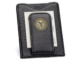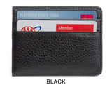 - Wallet is top quality pebble grain cow leather with polyester lining. Slim and light-weight with 2 card slots on back and inner pocket. Magnetic money clip on front. A metal plate is sewn into the wallet to protect magnetic cards. Measures 3" x 3-7/8".