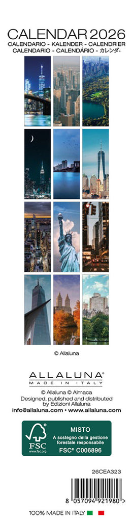 Experience the magic of New York City with this captivating 12-month calendar, featuring twelve stunning photographs that capture the vibrant energy and beauty of the Big Apple. From the dazzling lights of Times Square to the iconic architecture of skyscrapers and bridges, each month reveals a new side of the city. Perfect for city lovers and dreamers, this calendar brings the spirit of New York to your home all year long. Features 7 languages: Italian, English, German, French, Spanish, Portuguese, Japanese. Includes major international holidays, lunar phases, and zodiac signs.